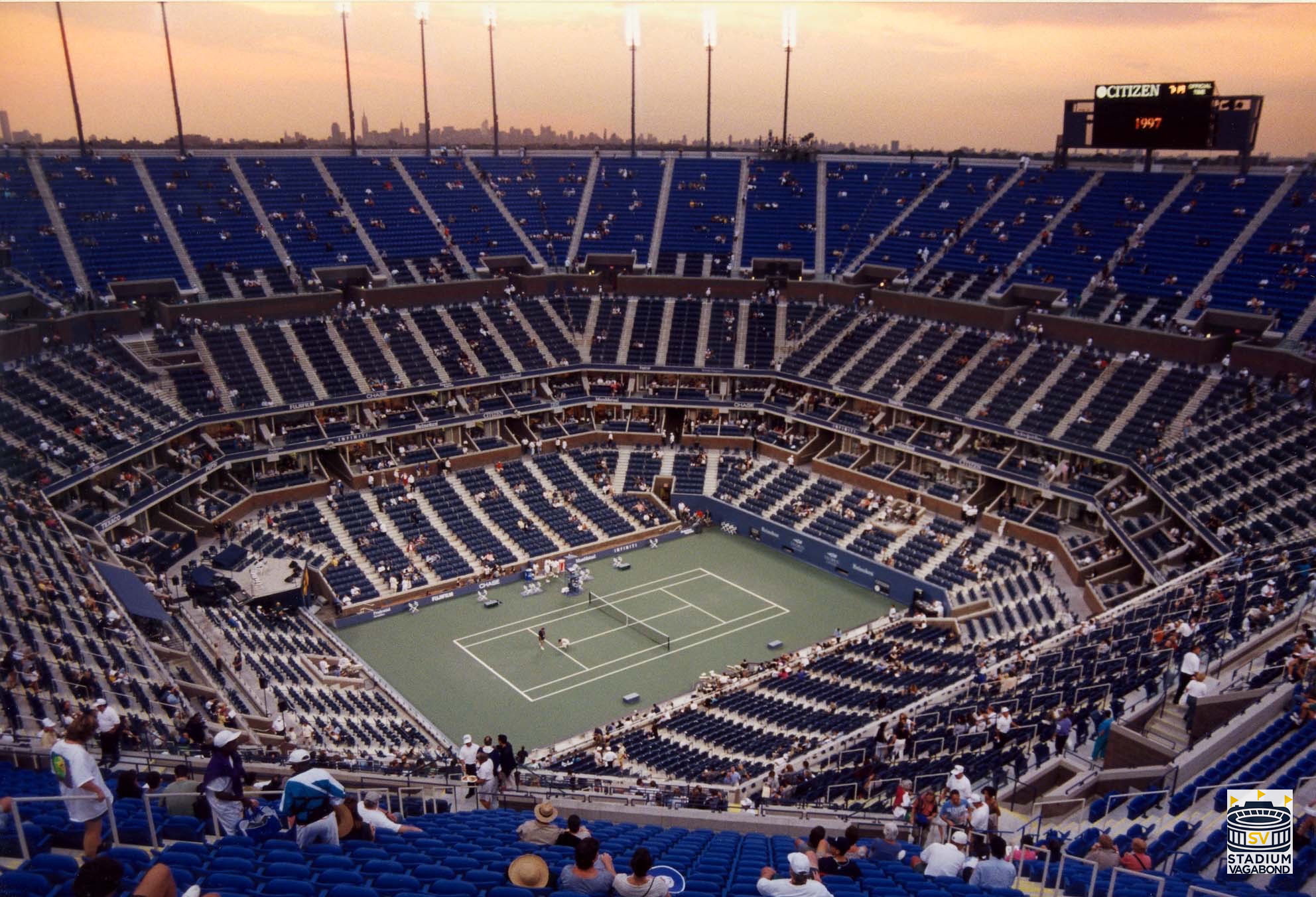 Arthur Ashe Stadium on the night of its official debut on August 25, 1997