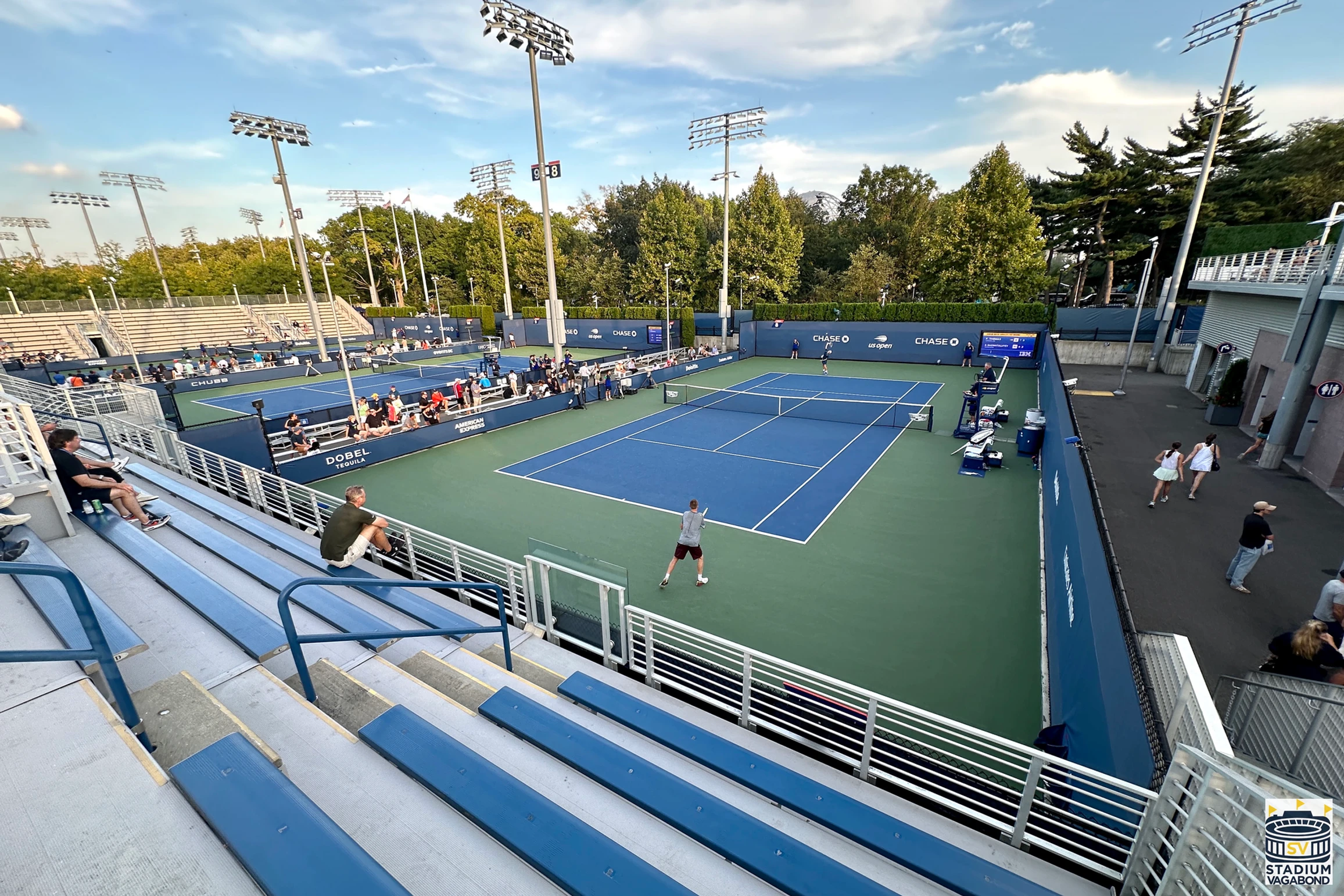 A tour of the secondary courts at the USTA Billie Jean King National Tennis Center in 2024. The bottom-row photos were taken from Arthur Ashe Stadium in 1997 and 2024, looking toward the Unisphere on the grounds of the 1964–65 World’s Fair in Flushing Meadows–Corona Park.