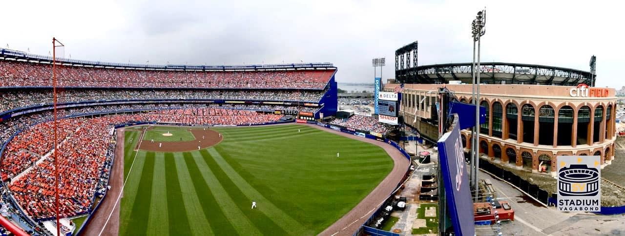 Top row: Citi Field viewed from the boardwalk connecting it to the USTA Billie Jean King National Tennis Center, and a panoramic view during the final month of Shea Stadium's existence, with Citi Field under construction next door. Middle row: Home plate views of Shea Stadium in 2003 and Citi Field in 2009. Bottom row: The iconic home run apple at Shea Stadium (left) and its replacement at Citi Field.