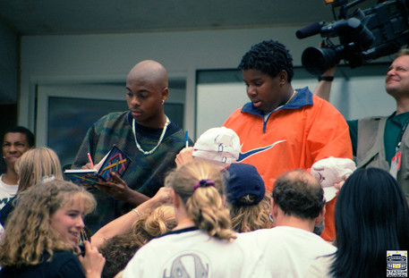 Top: Hanson, the pop band of three brothers from Oklahoma, performed their hit 'MMMBop' before a crowd of adoring and screaming fans. Bottom: Nickelodeon TV stars from "Good Burger" — Right: Kenan Thompson (who later became the longest-tenured cast member of Saturday Night Live) and Kel Mitchell."
